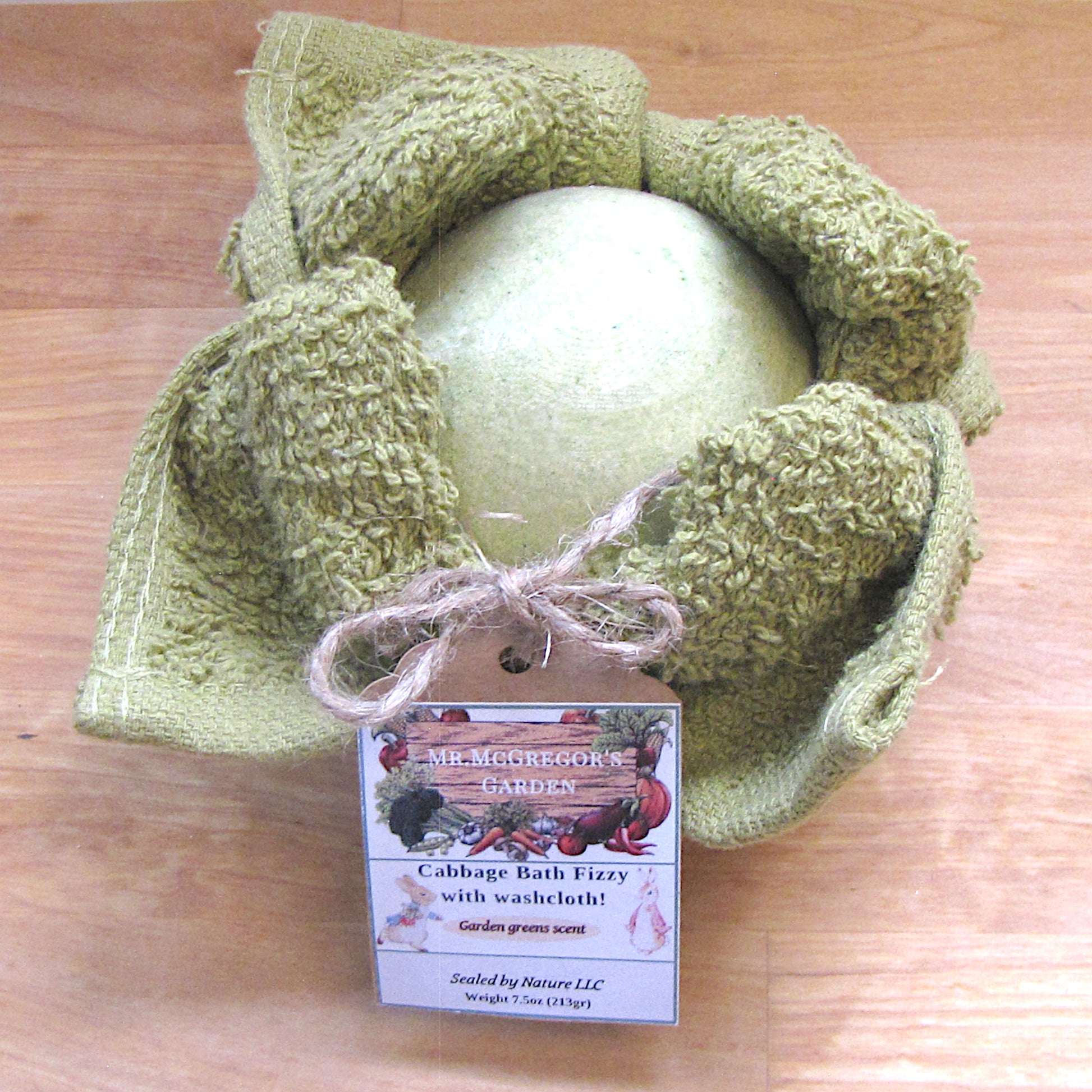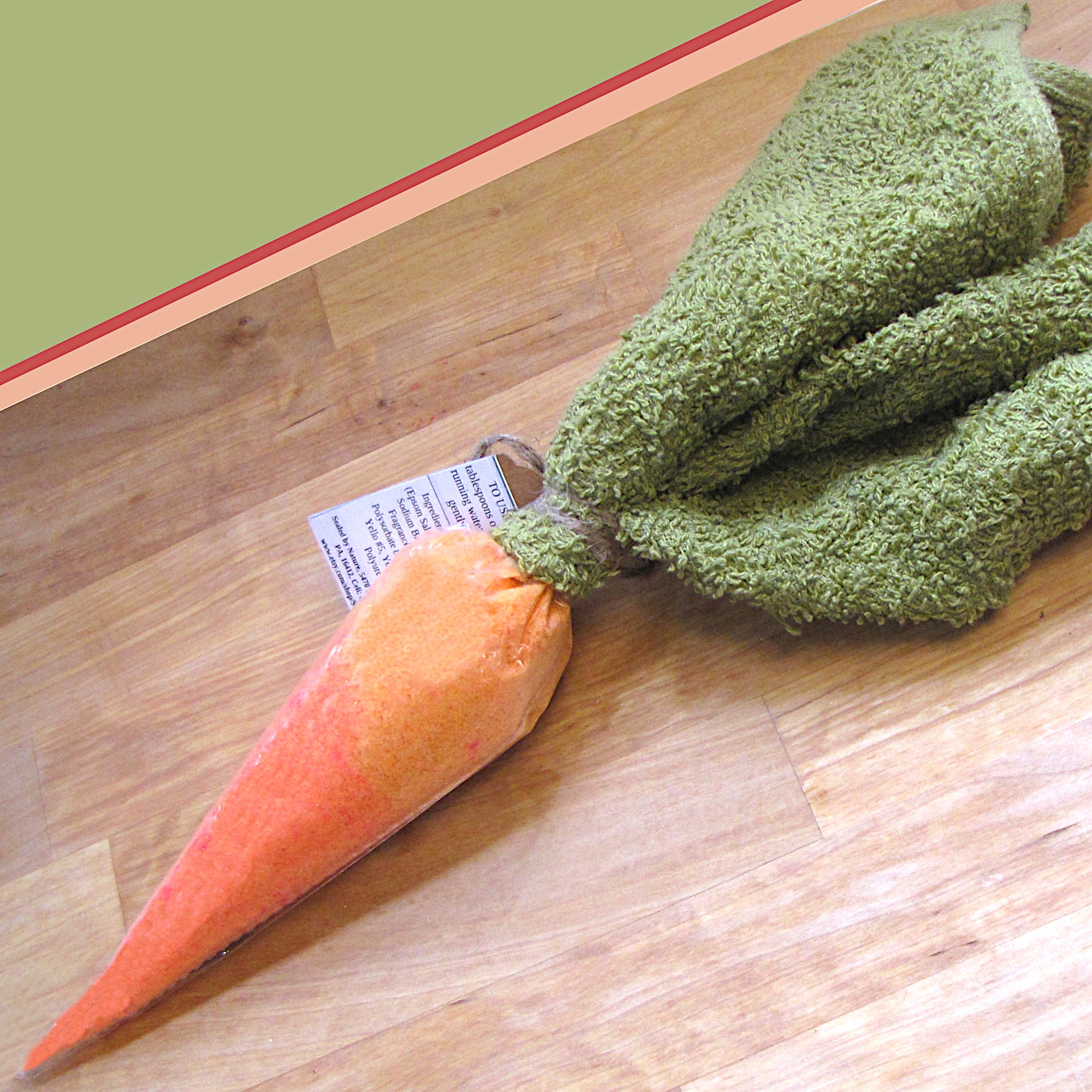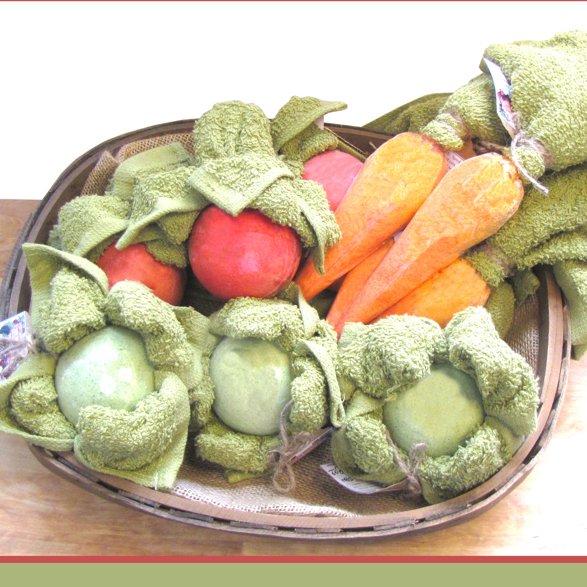 How about "veggies" in your bath tub! The design idea came from the Farmer's Market line of products. There are no Farmer's Markets without fresh vegetables. So here you go! Cabbages, tomatoes, and peas are bath bombs wrapped in green washcloth. Carrots are bath salts with washcloth "greens".